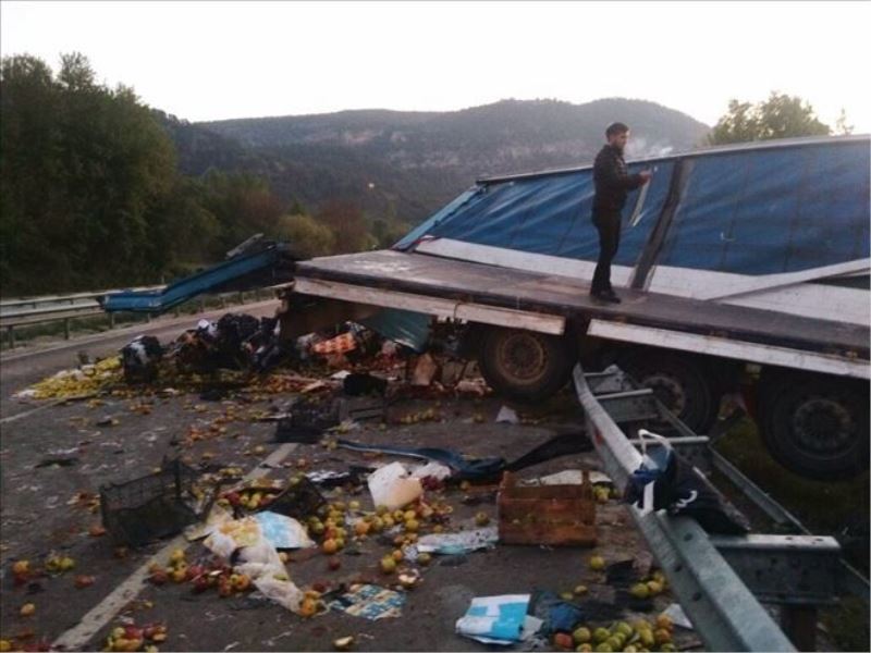 Karabük´te meyve yüklü tırın kontrolden çıkarak yan yatması sonucu meydana gelen kazada 3 kişi yaralandı.
