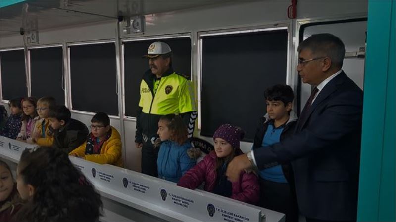 Öğrenciler, tırdaki mobil sınıfta trafik eğitimi aldıktan sonra polis eşliğinde özel hazırlanan yaya geçidi ve trafik lambalarının bulunduğu alanda akülü araç kullandı.