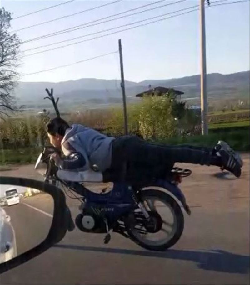 Bolu´da, motosikletinin üzerine yatarak seyir halinde olan sürücü, diğer sürücülerin uyarısına rağmen hızla yoluna devam etti.