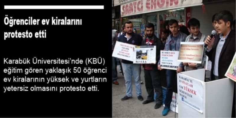Karabük Belediyesi önünde toplanan öğrenciler, kentteki ev kiralarının yüksek olmasını ve yurtların yetersiz olmasını protesto etti. Öğrenciler, `Okumaya mı geldik zengin etmeye mi bilemedik`, `Ev kiraları çok yüksek, öğrenciler mağdur`, `Bu sorun hem öğrencilerin hem de ailelerinin sorunudur` yazılı dövizler açtı. Öğrenciler daha sonra sorunlarını Başbakanlık`a göndermek için belediyenin önünde açtıkları stantta dilekçelerine vatandaşlardan imza atarak destek olmalarını istedi. Öğrenciler adına basın açıklaması yapan Ulaş Arslan, asgari ücretin üzerinde olan ev kiralarını ödemekte ve yurt bulmakta zorlandıklarını belirterek, şunları söyledi: