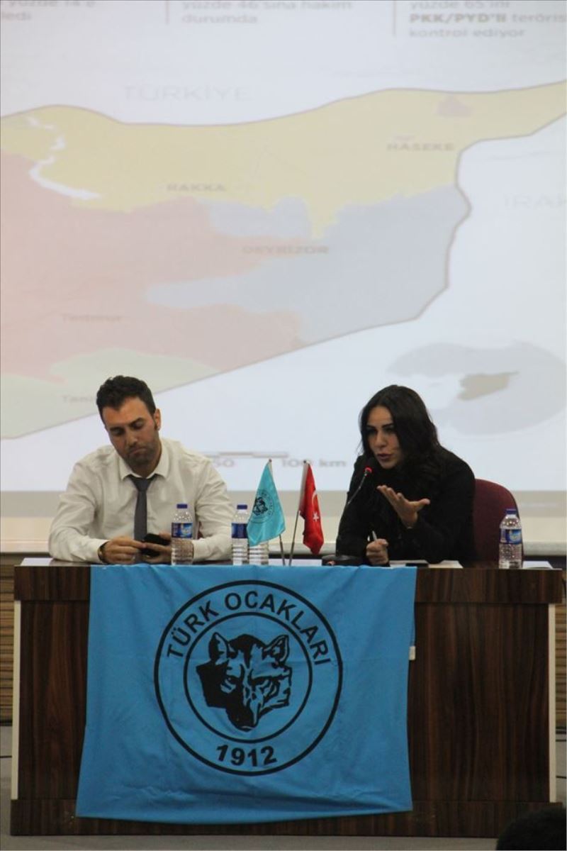 Konferansta Yrd. Doç. Dr. Marziye Memmedli ‘Osmanlı Döneminden Günümüze Kürtler´ konusunda bilgilendirmede bulunurken Yrd. Doç. Dr. Umut Kedikli geçmişten geleceğe Ortadoğu´daki gelişmeler ile ilgili konuştu.