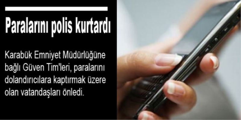 Karabük`te ikamet eden 10 vatandaşın ikametlerinde bulunan sabit telefon veya cep telefonlarından aranarak dolandırılmaya çalışılmış, 6 vatandaş Kemal Güneş Caddesinde ki bankalara ait ATM`lerden para göndermeye çalışırken Asayiş Şube Müdürlüğüne bağlı güven timleri tarafından bizzat önlenmiş, diğer şahısların da 155 Polis İmdat hattını aramaları neticesinde dolandırılmaları engellendi. 'İlimizde her türlü suç ve suç oluşumlarına karşı mücadelemiz kesintisiz sürdürülecektir' deildi.