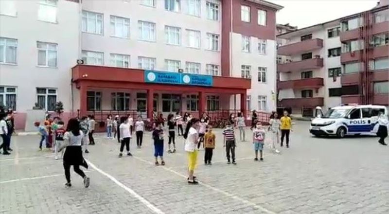 Polis ekipler, çocukları Kayabaşı İlkokulu bahçesinde toplayarak ekip otosundan müzik açtı. Sosyal mesafeye uyan çocuklar ekip otosundan çalan erik dalı şarkısıyla gönüllerince eğlendi.