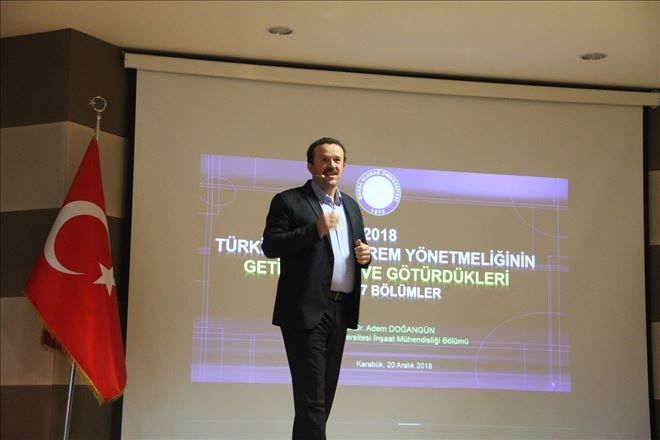 Karabük Üniversitesi öğretim üyelerinden Doç. Dr. Şenol Gürsoy´un daveti üzerine yükseklisans tez savunması için Karabük´e gelen Uludağ Üniversitesi İnşaat Mühendisliği Bölüm Başkanı Prof. Dr. Adem Doğangün, Karabük Üniversitesi Hamit Çepni Konferans Salonu´nda Türkiye Bina Deprem Yönetmeliği´nin Getirdikleri ve Götürdükleri konulu bir konferans verdi.