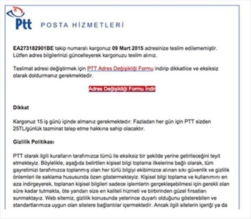 Demir, vatandaşların mail adreslerine PTT tarafından gönderilmiş gibi görünen ‘sahte mailler´ tespit ettiklerini belirterek, “Söz konusu maillerde bulunan linklere tıklandığında şirketimize ait gönderi takip sayfasının bir benzeri açılmakta olup, ‘Adres Değişiklik Formu´ nun indirilmesi istenmektedir. Dosyanın indirilmesi durumunda içerisinde bulunan virüs kişinin bilgisayarına bulaşmakta ve bilgisayardaki veriler ulaşılamaz olmaktadır.Müşterilerimizin mağdur olmamaları için maile gelen linki tıklamamaları ayrıca zararlı siteden indirilen dosyanın zamanla farklı türevleri çıktığından etkilenmemek için bilgisayarlarında antivirüs programlarının en güncel halini bulundurmaları kendi güvenlikleri açısından elzemdir” dedi.