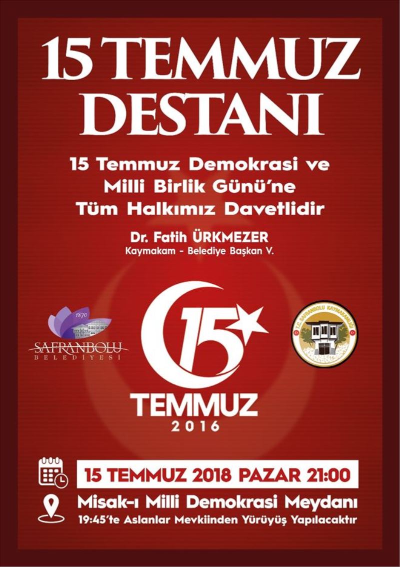 Bu kapsamda Osmanlı´nın Mirası Safranbolu olarak 15 Temmuz 2018 Pazar günü Safranbolu Kaymakamlığı ve Safranbolu Belediye Başkanlığı önderliğinde tüm yurtta olduğu gibi bir program tertip edeceklerini kaydeden Ürkmezer; “ 19.45´de Aslanlar Mevkiinden Misak-ı Milli Demokrasi Meydanına gerçekleştireceğimiz Demokrasi Yürüyüşü ile başlayacak ve gece boyu devam edecek olan programımıza Milli ve Manevi değerlere her daim sonuna kadar sahip çıkan Safranbolulu hemşerilerimi davet ediyor, bu vesile ile başta 15 Temmuz Şehitlerimiz olmak üzere tüm şehitlerimizi şükranla yâd ediyor, gazilerimize hayırlı uzun bir ömür diliyorum” dedi.