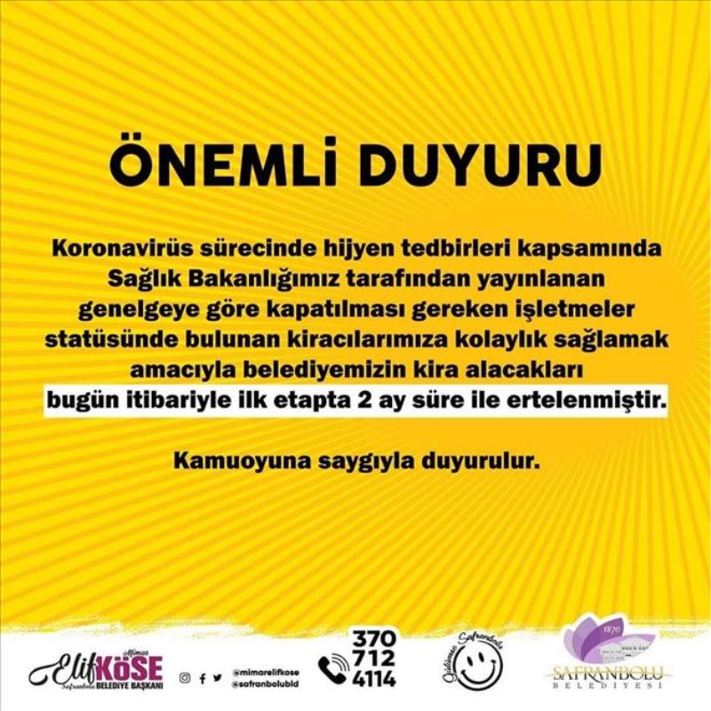 Safranbolu Belediyesi sosyal medya hesabından yaptığı açıklamada , “Sağlık Bakanlığımız tarafından yayınlanan genelgeye göre kapatılması gereken işletmeler statüsünde bulunan kiracılarımıza kolaylık sağlamak amacıyla belediyemizin kira alacakları bugün itibariyle ilk etapta 2 ay süre ile ertelenmiştir” denildi.