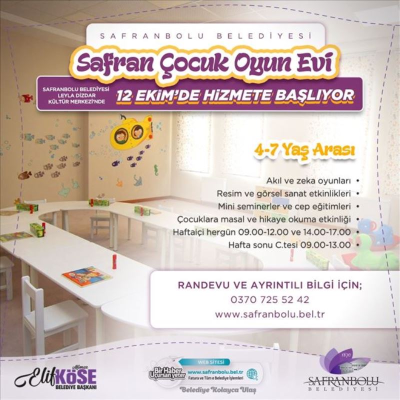 Safranbolu Belediyesi bünyesinde kurulan 'Safran Çocuk Oyun Evi', Safranbolu Belediyesi Leyla Dizdar Kültür Merkezinde hizmet vermeye başlayacak.