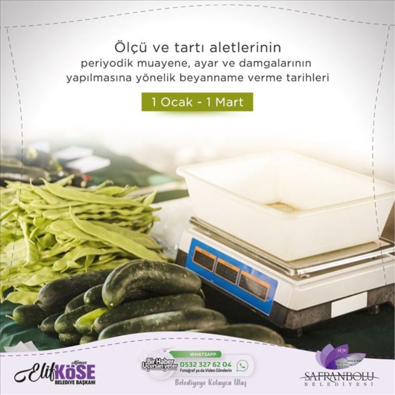 Yapılan açıklama, 'Safranbolu Belediyesi Zabıta Müdürlüğüne bağlı Ölçü Ayar Memurluğu tarafından alınan beyannamenin yasa gereği zorunlu olduğu açıklanarak, 1 Ocak 2021 tarihinden itibaren, ellerinde elektronik, mekanik ölçü, tartı aletleri bulunan esnaf, pazarcı, işyeri sahipleri ile resmi ve özel dairelerin, Safranbolu Belediyesi Ölçü Ayar Memurluğuna 1 Mart 2021 günü mesai bitimine kadar müracaat etmeleri gerekiyor. Her türlü masa, ibreli, baskül, kantar, elektronik, asma, litre, metre ve kilogramlar, ölçü ve tartı aletlerinin her iki yılda bir olmak üzere periyodik muayene, ayar ve damgalarının yapılması gerekiyor' denildi.