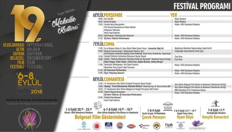 6-8 Eylül tarihleri arasında gerçekleşecek Festival´in sekretaryasını yürüten Safranbolu Belediyesi Kültür ve Sosyal İşler Müdürlüğü hazırlıklarda son aşamaya geldi.´ ´Kültürel Miras ve Korumacılık´´ana teması ile 19. kez kapılarını sanatseverlere açacak olan festivalin bu yılki yan teması ise ‘Mahalle Kültürü´ olarak belirlendi.