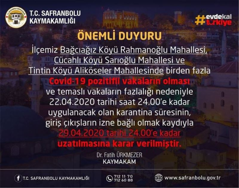 Safranbolu Kaymakamlığı tarafından yapılan açıklamada, “İlçemiz Bağcıaz Köyü Rahmanoğlu Mahallesi, Cücahlı Köyü Sarıoğlu Mahallesi, Tintin Köyü Aliköseler Mahallesinde birden fazla Covid-19 pozitifli vakaların olması ve temaslı vakaların fazlalığı nedeniyle 22.04.2020 tarihi saat 00.00´a kadar uygulanacak olan karantina süresinin giriş çıkışların izne bağlı olmak kaydıyla 29.04.2020 tarihi saat 00.00´a kadar uzatılmasına karar verilmiştir' denildi.