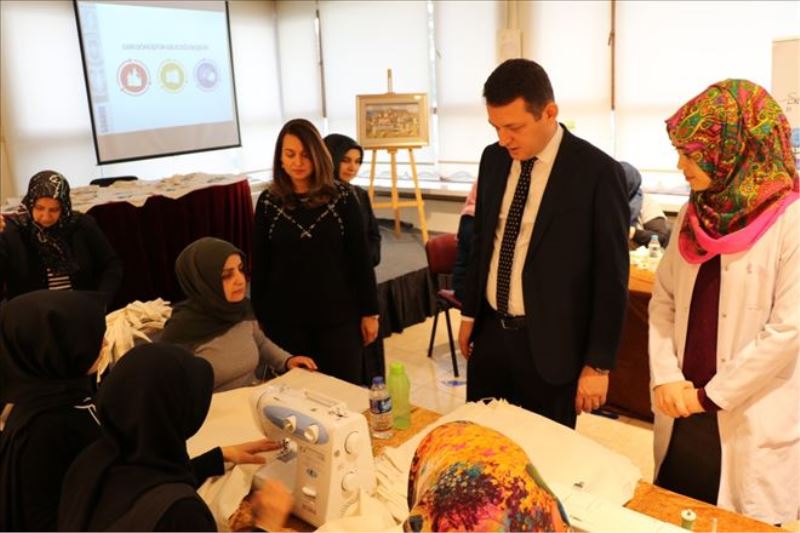 Safranbolu Kültür ve Eğitim Merkezinde (SAKEM) Çalışma ve İş Kurumu İl Müdürlüğü (İŞKUR) ile Halk Eğitim Merkezi iş birliğiyle açılan kurslarda kadınlar, üzerinde 'Safranbolu Kaymakamlığı', 'Safranbolu Belediyesi' ve 'sıfır atık' logolarının yer aldığı bez çantaları makinelerde dikerken, fileler de el işiyle yapılıyor.