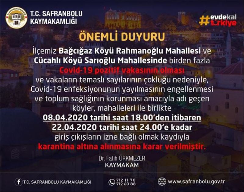 'İlçemiz Bağcığaz köyü Rahmanoğlu Mahallesi ve Cücahlı köyü Sarıoğlu Mahallesi´nde birden fazla Covid-19 pozitif vakasının olması ve vakaların temaslı sayılarının çokluğu nedeniyle, Covid-19 enfeksiyonunun yayılmasının engellenmesi ve toplum sağlığının korunması amacıyla adı geçen köyler, mahalleleri ile birlikte 08.04.2020 tarihi saat 18.00´dan itibaren 22.04.2020 tarihi saat 24.00´a kadar giriş çıkışların izne bağlı olmak kaydıyla karantina altına alınmasına karar verilmiştir.'