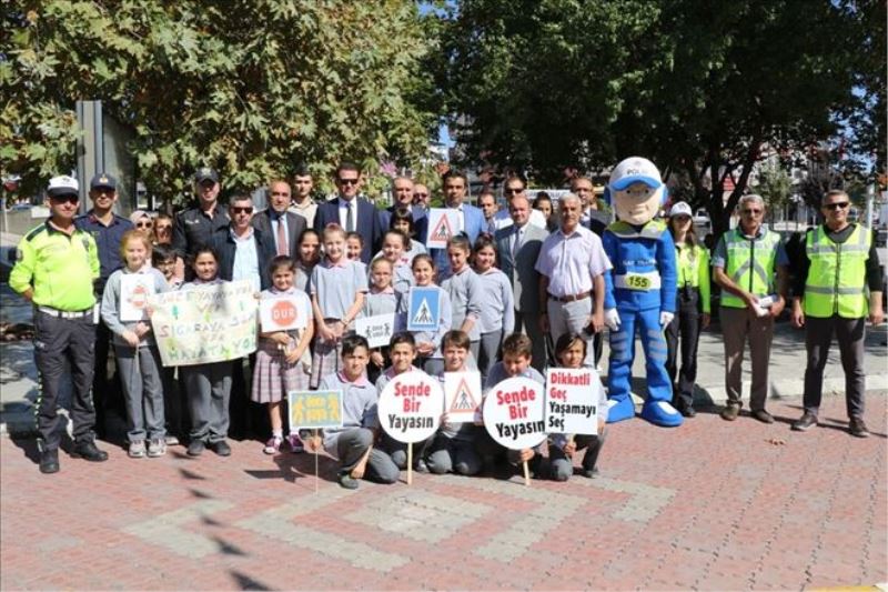 Kaymakam Ürkmezer ve diğer protokol üyeleri, yayalara ve sürücülere broşür dağıttı. 100 Dükkanlar mevkisi ve Sadri Artunç Caddesi´nde hep birlikte yaya geçidinden geçildi.