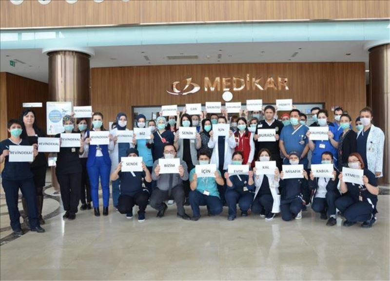 Hastanenin sitesinden yapılan paylaşımda sağlık personelinin, vatandaşlara hitaben, 'Biz senin için burada kalıyoruz. Sen de bizim için evde kal. Misafir kabul etme' yazılı dövizlerle poz verdikleri fotoğrafı paylaştı.