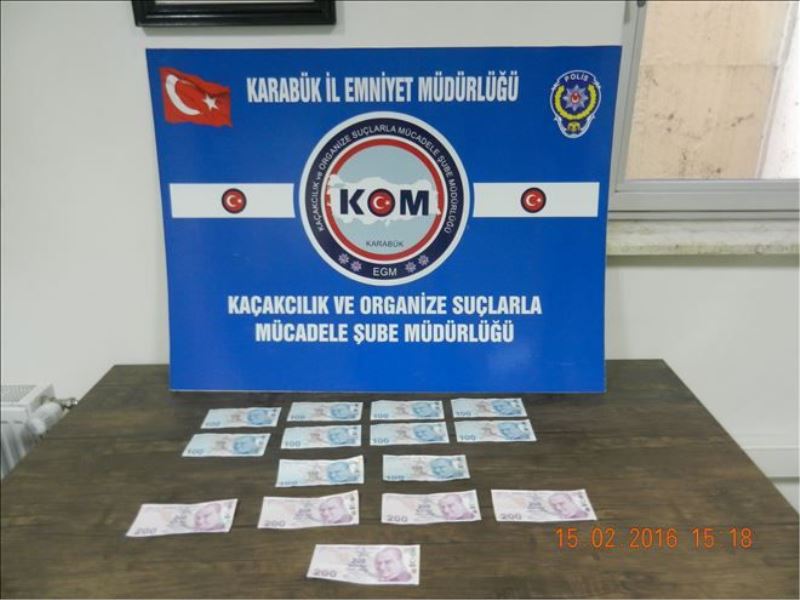 Alınan bilgilere göre, Bayır Mahallesi Fevzi Fırat Caddesi üzerindeki bir işyerine 8 adet 100 TL sahte para verilmesi üzerine harekete geçen İl Emniyet Müdürlüğü KOM Şube Müdürlüğü görevlileri çalışmaları sonucu sahte parayı veren şahsın A.B (26) isimli şahıs olduğu tespit edildi. Şüpheli şahsın evinde yapılan aramada ise 2 adet 200 TL ve 5 adet 200 TL´lik sahte banknot ele geçirildi. A.B(26) isimli şahıs hakkında adli işlem yürütülerek şahıs çıkarıldığı adli makamlarca tutuklanarak Karabük T tipi Ceza İnfaz Kurumuna teslim edildi.