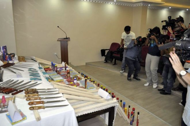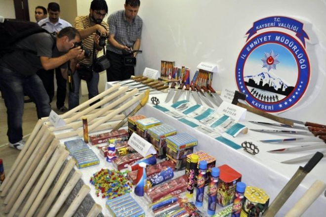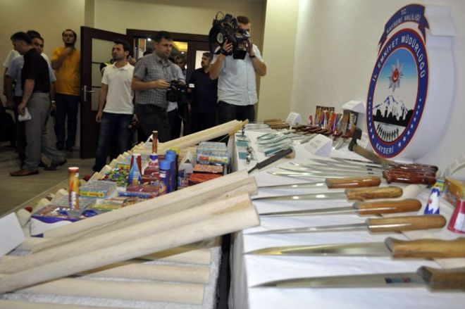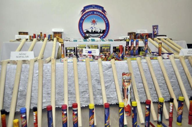 Kayseri’de Süper Kupa öncesinde polis ekiplerinin 6 ayrı arama noktasında gerçekleştirdiği aramalarda 82 adet sopa, 50 adet pala, iki adet muşta, balta, testere ve patlayıcı maddeler ele geçirildi.İl Emniyet Müdürü Mustafa Aydın, Süper Kupaöncesinde gereken tüm önlemlerin alındığını veGalatasaray’ın kazandığı maç sonrasında herhangi bir olay yaşanmadığını belirtti. Mustafa Aydın, müsabakanın güvenlik bir şekilde oynanması için şehir girişlerinde 6 farklı noktada arama gerçekleştirdiklerini söyledi. Aydın, “Bu aramalarda pala tabir edilen bıçak olmak üzere 50 adet bıçak, 2 adet muşta, bir adet balta ve testere, özel olarak hazırlanmış 82 adet sopa, çok sayıda proteknik patlayıcı madde olarak tabir edilen 350 adet maytap, 250 adet torpil, 150 adet havai fişek ve volkan ele geçirildi” dedi.Emniyet Müdürü Mustafa Aydın, maç sırasında 3 bin 800 polis memurunun görev yaptığını, 750 polis memurunun ise diğer illerden takviye olarak geldiğini kaydederek, “Maçta 500 özel güvenlik elemanı da görev yaptı. Bayram zamanında meslektaşlarımız tatillerinden fedakarlık yaparak görev yaptılar. Buradan maç sırasında görev yapan tüm personelimize özverili çalışmalarından ötürü teşekkür ediyorum” diye konuştu.