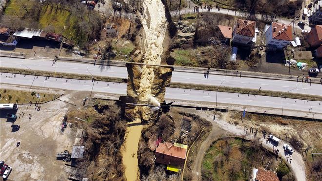 Safranbolu Karayolları 153. Şube Şefliği ekipleri, yaklaşık 40 metrelik kısmı çöken ve 20 metrelik derinlik oluşan yolda çalışma başlatırken, insansız hava aracıyla (drone) çekilen görüntülerde tahribatın boyutu da ortaya çıktı.