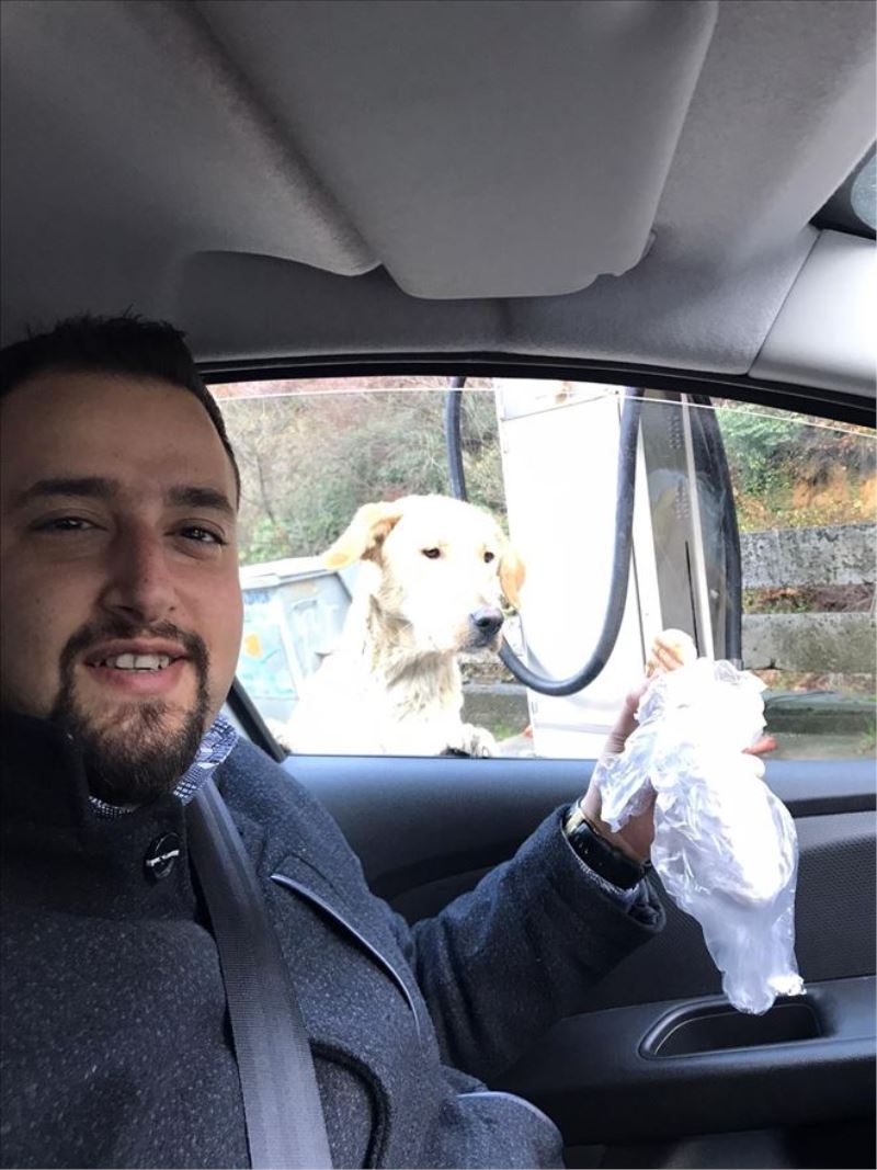 Zonguldak´ta İlaç mümessilliği yapan Yiğit Atalar, yolda seyir halindeyken aç olduğu için önüne kesen sokak köpekleri için kendi için yanında getirdiği tostunu paylaştı.