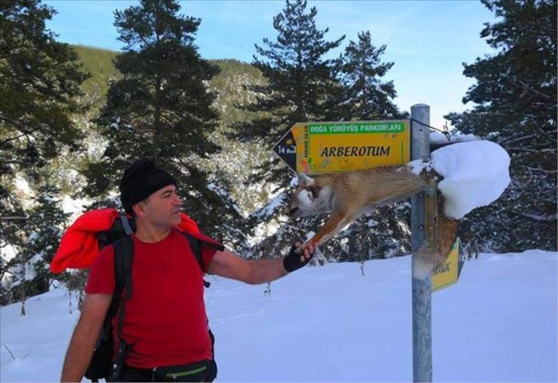 Arslan, soğuk hava ve kar yağışı ile birlikte tabelanın üzerinde donan tilkiyi yere indirdi. Tilkinin fotoğraflarını Facebook hesabında paylaşan Arslan, 'Köye doğru yürürken yön tabelasında tilkiyi fark ettik. Kar yağdıktan sonra tilki asılı bulunduğu tabelada donmuş. Kurşun boyun kısmından girmiş diğer taraftan çıkmış. Resimlerini çektikten sonra tilkiyi tabeladan indirdik. Bunu yapanların avcı olduğunu düşünüyorum. Ormanda bulunan canlılar yiyecek derdindeyken kaçak avcılar zevk ve eğlence derdindeler. Tilkiyi vurdukları yetmiyor gibi binlerce turistin ziyaret geçiş noktası olan direklerden birine asmaları tam canilik' dedi.