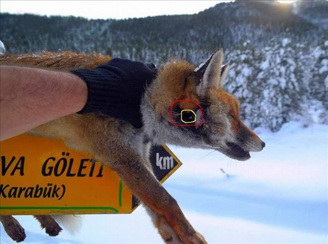 Doğa fotoğrafçısı Recep Arslan, Karabük´ün Yenice ilçesi ormanlarındaki gezisi sırasında, Karağaç Köyü mevkiindeki doğa yürüyüş parkuru üzerinde bulunan yön tabelasının üzerine asılmış tilki gördü. Recep Arslan, boyun kısmında kurşun deliği bulunan tilkinin, kar yağmadan önce avcılar tarafından vurulmuş olabileceğini söyledi.