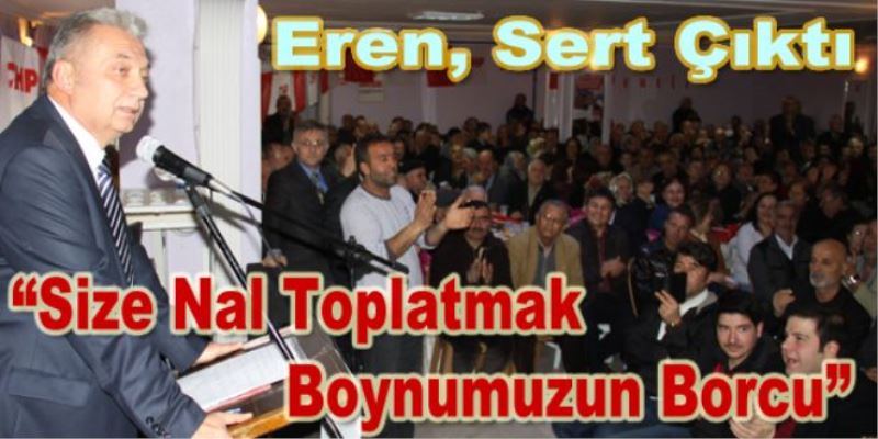 Perşembe pazarının bulunduğu arsanın Hazine’ye devredildiğini belirten Eren, 4 imarın 4 kata izin verdiğini arsaya 11 katlı düğün salonu yapacaklarını belirerek, “Her Perşembe günü yoğun olarak pazara gittiğiniz mekan var. Bunlar ne kadar yese gözleri doymuyor, ne kadar yandaşlarını abat etseler doymuyorlar. O perşembe pazarındaki belediyenin olan arsayı almışlar Göztepe’ye kaydırmışlar, Göztepe’den de Hazineye ait bir arsayı oraya vermişler. Yani şuanda Perşembe pazarının kurulmuş olduğu arsa belediyenin elinden çıktı, belediyenin böyle bir arsası yok. Hazine ne zaman istese o araziyi satabilir. Ama bunlarda hiç utanma yok. Yaptıkları toplantı da vatandaşlarımıza seçim beyannamesi dağıttılar. Baktığınız zaman maşallah fotoğraf albümü gibi yapılan bir şey yok, yapılacakların içine aile albümünü koysanız ancak böyle olur. Yapılacakların içinde de belediyenin uhdesinden çıkan arsanın üzerine düğün sarayı yapacaklarmış. Kaç katlı biliyor musunuz? 11 katı düğün sarayı yapacaklarmış. Bunlar imar da yolsuzluğa alıştılar zaten. Hemen oranın altında yolsuz imar yolsuzluğuyla yapılan bina var, vicdansızlar, Allah’tan korkmayanlar, kuldan utanmayalar oradaki binaların yüksekliği 4 kat sen belediye olarak şehrin göbeğine bu hançeri nasıl çakabilirsin? Çaktırır mıyız sana bu hançeri? Eğer yaptıklarınızı burnunuzdan fitil fitil getirmezsek, çaldıklarınızın, çırptıklarınızın hesabını sormazsak Allah bunun hesabını sorsun” diye konuştu.
