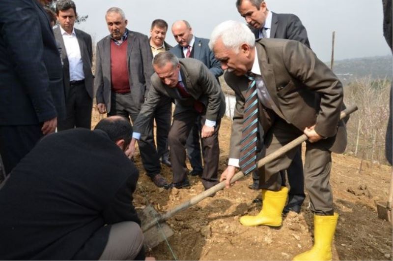 Vali Orhan Alimoğlu tarafından bağ çubuğu dikilmesinin ardından çevre köy muhtarlarına ve köylülere meyve fidanı dağıtıldı.
