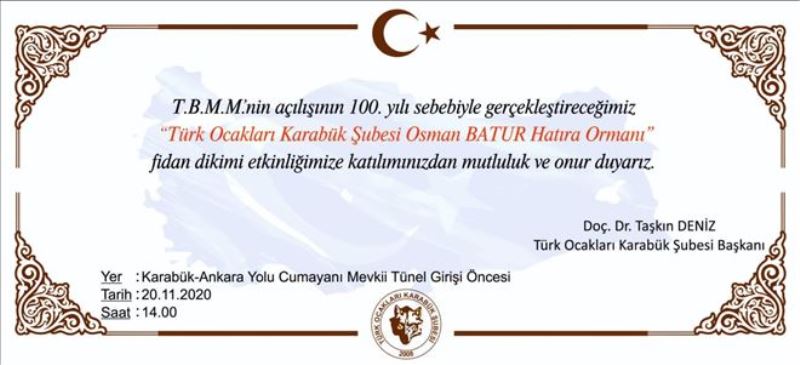 Türk Ocakları Karabük Şubesi Başkanı Doç. Dr. Taşkın Deniz yaptığı açıklamada, “23 Nisan 1920´de açılan TBMM´nin 100. yılındaki 'Millî Hâkimiyet Kutlamaları”nda; erozyonla mücadele ve orman varlığının artırılması kapsamında, Orman Genel Müdürlüğü tarafından ülke genelinde yürütülen ağaçlandırma ve erozyon kontrolü çalışmaları; hayatını kaybetmiş veya hâlen hayatta olan, Türklüğe hizmet etmiş ve bir yönüyle Türk Ocaklarında faaliyette bulunmuş büyüklerimizin adının verileceği 65 Hatıra Ormanı kurmak suretiyle Türk Ocakları tarafından da desteklenecektir. Böylece Türklüğe hizmet eden büyüklerimizin adı yaşatılmış ve gelecek nesillere tanıtılmış olacaktır. Bu amaçla hazırlanan Hatıra Ormanı Projesi Protokolü, 23.01.2020 tarihinde imzalanmıştır. Protokol kapsamında, 2020 yılında, ülkemizdeki iklim şartları da dikkate alınarak bir yıllık süreçte, 65 farklı bölgede Hatıra Ormanı kurulacaktır.