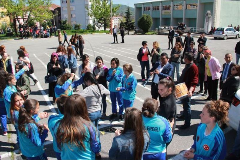 Türkiye şampiyonası dönüşü kız futbol takımı antrenör ve oyuncularına Ereğli Merkez Anadolu Lisesi bahçesinde davullu zurnalı karşılama yapıldı.