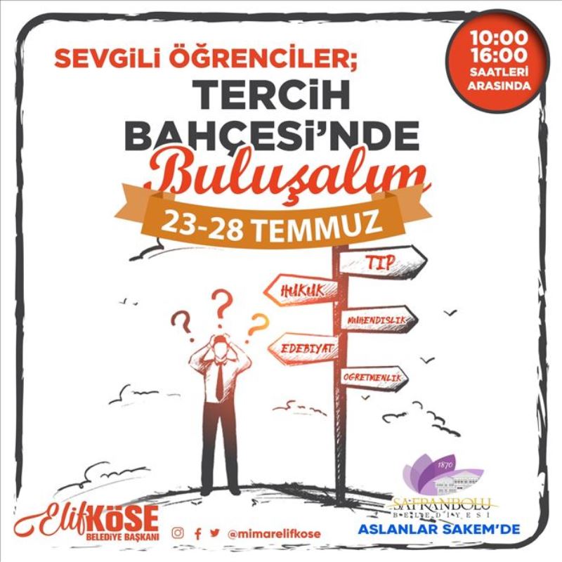 Bu kapsamda Safranbolu Belediyesi Kültür ve Sosyal İşler Müdürlüğü tarafından, Safranbolu´da bulunan özel liselerin de katkılarıyla, üniversite sınavına giren ve tercih yapacak tüm öğrencilere destek olmak amacı ile 'Tercih Alanı' oluşturulacak.