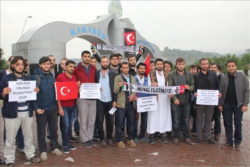 Grup adına basın açıklamasını yapan Karabük Üniversitesi öğrencisi Yusuf Yaser Eryiğit, Filistin toprakları ve Mescid-i Aksa´nın her geçen gün İsrail saldırıları altında ezildiğini ifade ederek, “Kardeşlerimiz acımasız işkencelere maruz bırakılıyor. Filistin halkı her şeye rağmen onurlu direnişlerine devam ediyor. Bizlerde şanlı Filistin direnişinin her zaman yanında olduk, olacağız. Sesimiz çıktığınca haykıracağız ki, Yaşasın Özgür Filistin. Uluslararası sularda Gazze´ye insani yardım malzemesi ulaştırmayı hedefleyen bu davaya gönül vermiş masum insanlarımızı şehit ettiniz. Haşr suresi 13 ve 14. Ayettende bildiğimiz gibi, sizin kalplerinizdeki korku, müstahkem kaleler gibi güvendiğiniz silahlarınızı masum sivillere doğrulttu. Ama biz bunu sadece bugün anlamadık. Filistin de ve Gazze de kendi namusunu korumaya çalışan mazlum kardeşlerimizin,