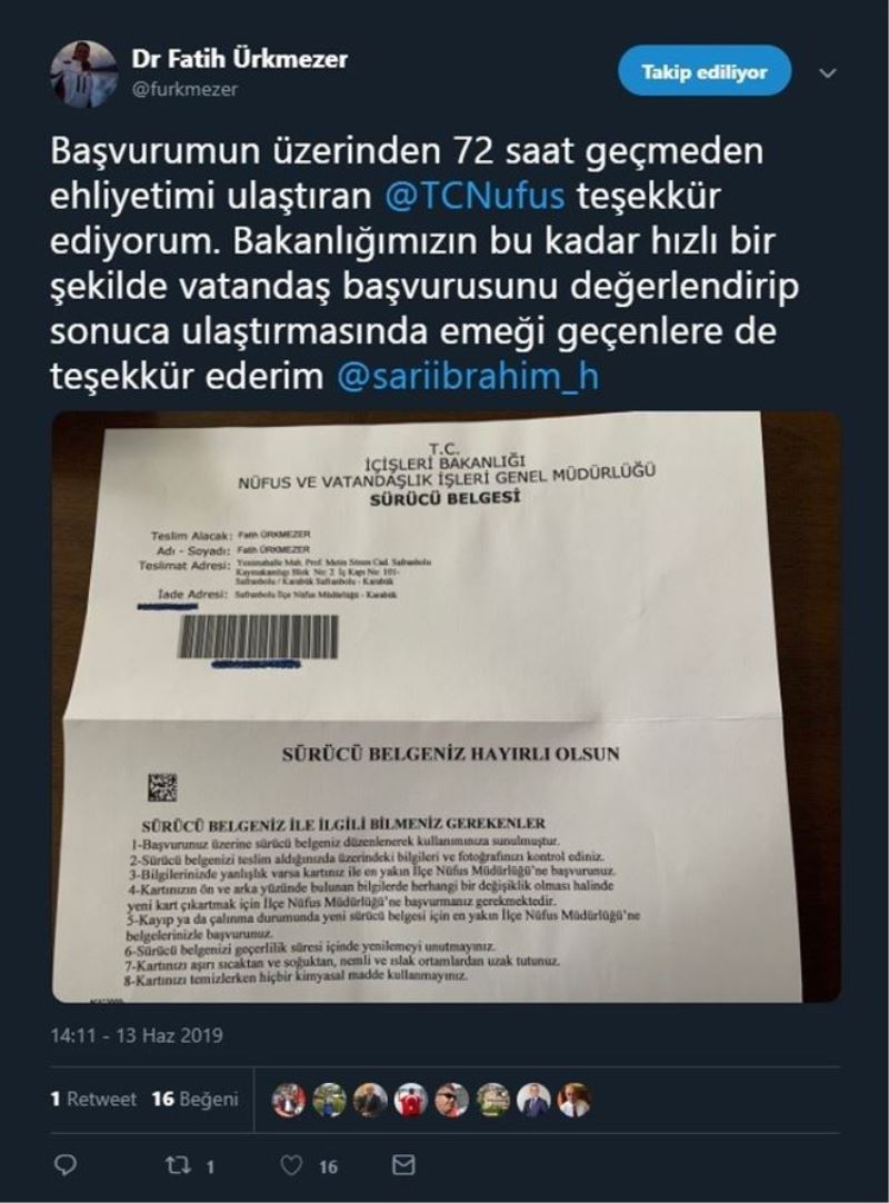 Ürkmezer sosyal medya üzerinden yaptığı açıklamada, “Başvurumun üzerinden 72 saat geçmeden ehliyetimi ulaştıran Nüfus ve Vatandaşlık İşleri Genel Müdürlüğüne ve Nüfus ve Vatandaşlık İşleri Genel Müdürü Hüseyin Engin Sarıibrahim´e teşekkür ediyorum. Bakanlığımızın bu kadar hızlı bir şekilde vatandaş başvurusunu değerlendirip sonuca ulaştırmasında emeği geçenlere de teşekkür ederim.” dedi.