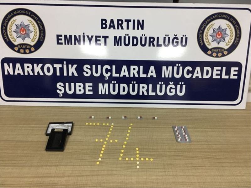 Bartın İl Emniyet Müdürlüğü Narkotik Suçlarla Mücadele Şube Müdürlüğü tarafından uyuşturucu madde ticareti yapan şahıslara yönelik merkez Gölbucağı Kavşağı üzerinde düzenlenen operasyonda Ü.P ve C.A. isimli şüpheliler gözaltına alındı. Zanlıların üzerlerinde yapılan aramada, 44 adet ekstasy ve 19 adet yeşil reçeteye tabi sentetik ilaç yakalandı.