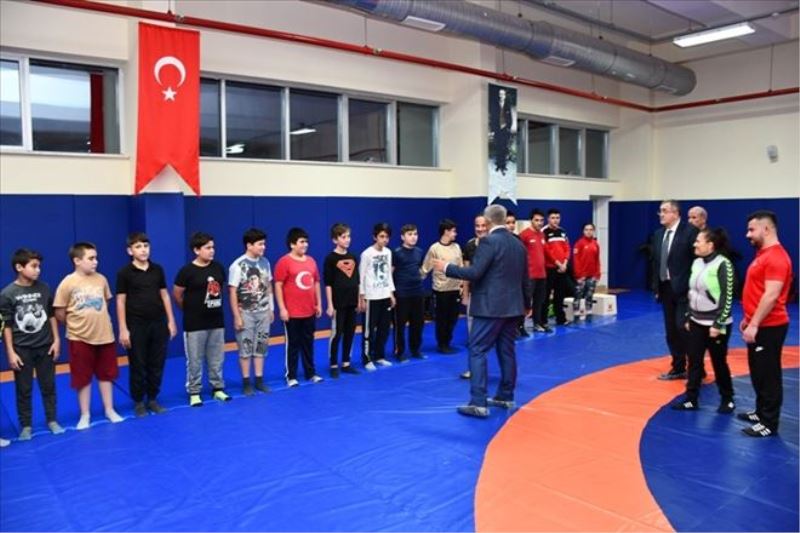 Vali Gürel, Gençlik ve Spor İl Müdürü Abdulkadir Çetin´den bilgi alırken, güreş, boks, judo, atletizim, voleybol, taekwando, cimnastik ve eskrim salonlarını ziyaret ederek, antrenörler ve sporcularla bir süre sohbet etti.