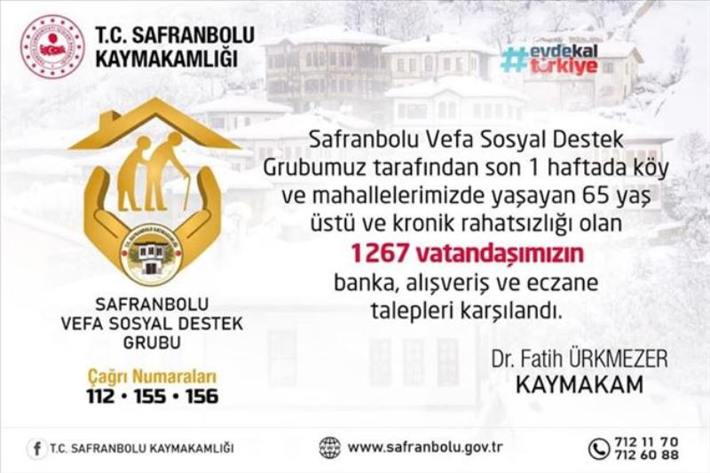 Safranbolu Kaymakamı Fatih Ürkmezer, Vefa Sosyal Destek Grubu tarafından bir haftada bin 267 vatandaşın alışveriş, banka ve eczane taleplerinin karşılandığını söyledi.