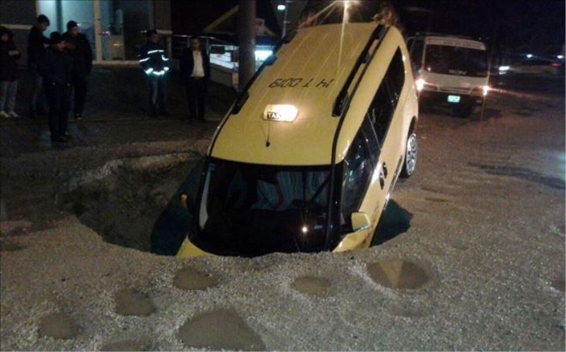 Bolu´da gece yarısı şiddetli yağmur nedeniyle yolda oluşan göçüğü farkedemeyen bir taksi çukurun içine düştü.