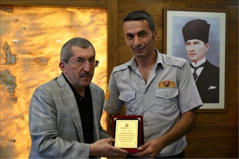 Merkeze bağlı Kayabaşı Mahallesi Engin Sokak´ta çıkan yangında dumandan etkilenen 3,5 aylık bebeği kurtaran Karabük Belediyesi İtfaiye Müdürlüğü personeli Haşim Güneş ve Ulaş Verim´e, Belediye Başkanı Rafet Vergili tarafından plaket takdim edildi. İtfaiye Müdür Vekili Mustafa Danapınar ile birlikte Verim ve Güneş´i makamında tebrik eden Vergili, 'Sizlerle bir kez daha gurur duyduk. Göstermiş olduğunuz kahramanlık hepimizi mutlu etti. Kurtarma anında dikkatli ve titiz davranarak zamanla yarıştınız. 3,5 aylık bir bebeğin hayata tutunmasına vesile oldunuz.' dedi.