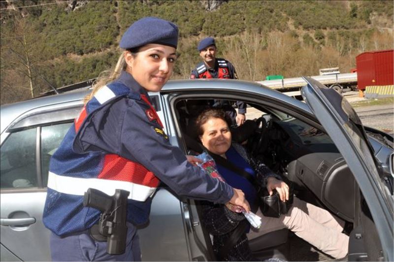 Yenice-Karabük karayolu üzerinde bulunan kontrol noktasında jandarma ekipleri, buradan özel otomobilleri ile geçen sürücüsü kadın olan araçların yanı sıra erkek sürücülerin yanında bulunan kadın yolculara karanfil vererek Kadınlar Günü´nü kutladı.