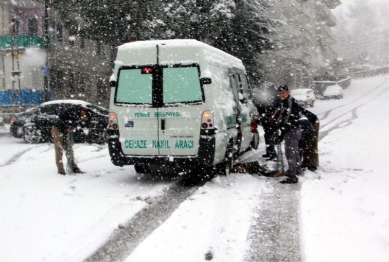 Yoğun kar yağışı nedeniyle yüksek mahallere çıkmaya çalışan araçlar zorluk çekerken, cenaze aracı zincir takarak mezarlığa ulaştı. Bazı araçlar ise çıkamadıkları yokuşları geri geri giderek çıkmaya çalıştı. Kar yağışından etkilenen kuşlar da kar altında yiyecek aradı.