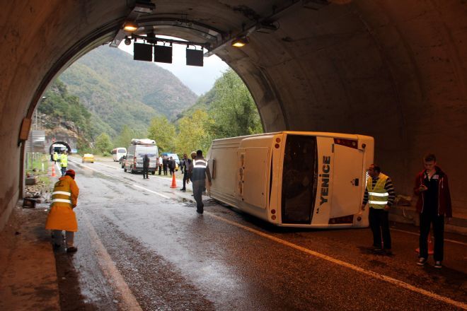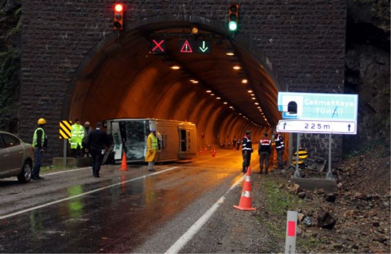 Edinilen bilgiye göre, Yenice ilçesinde Karabük’e seyir halinde olan Hasan Arat (32) 78 M 5009 plakalı yolcu minibüs, Çakmakkaya Tüneli girişinde aşırı yağışlar sonrası dağdan kopup yola düşen kayalara çarptı. Çarpmanın etkisiyle denge kolu kırılan minibüs, tünelin girişine çarparak devrildi.
