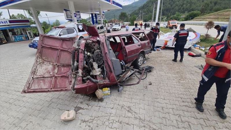 Karabük-Kastamonu karayolunda meydana gelen trafik kazasında, yoldan çıkan bir otomobil akaryakıt istasyonun reklam tabelasına çarptı. Güvenlik kamerasına yansıyan kazada hurda yığına dönenen otomobilde biri ağır 2 kişi yaralandı.