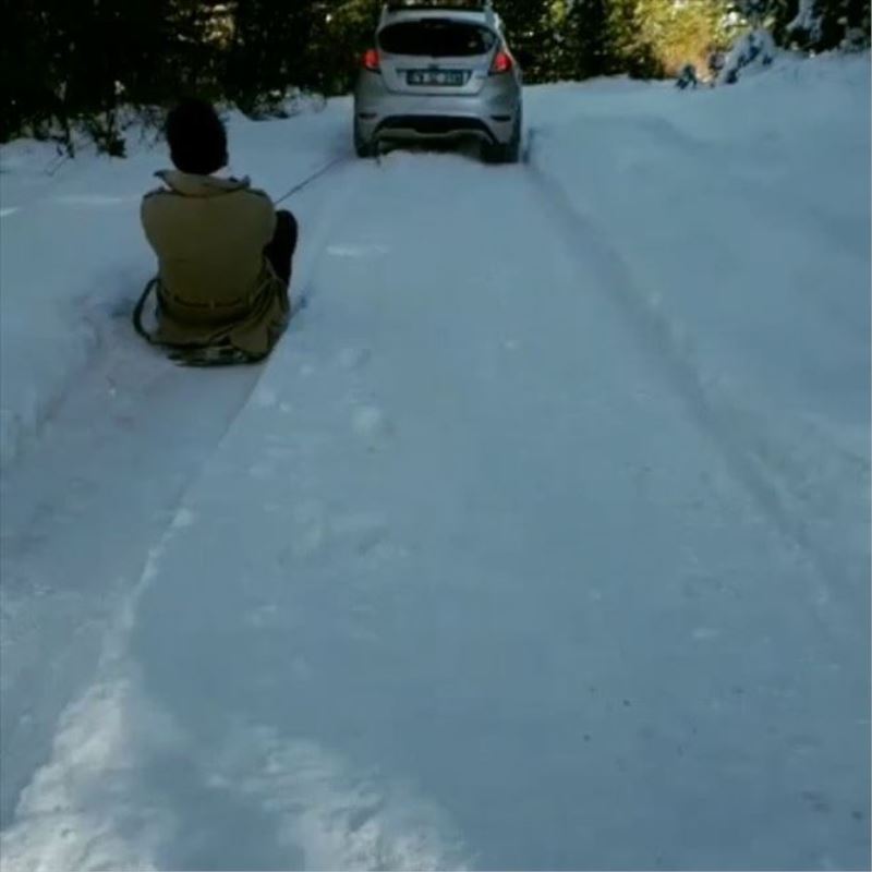 Safranbolu´da bir grup vatandaş araçların arkasına bağladıkları kızakla kayarak karın keyfini çıkardı.