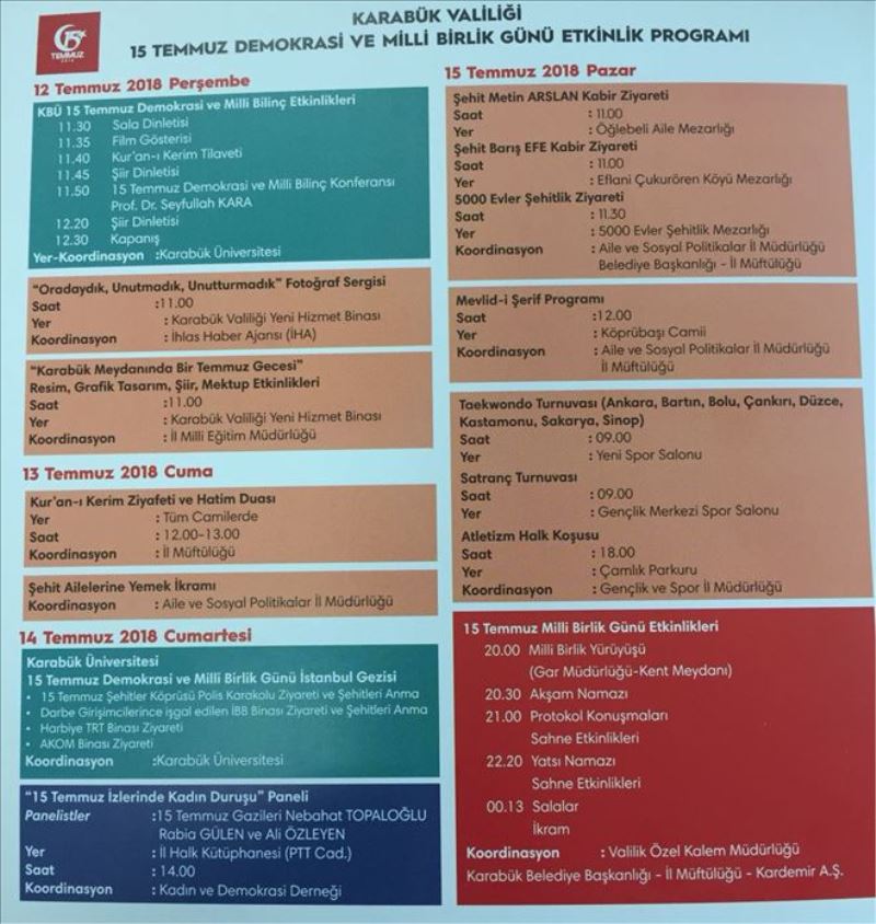 Karabük Üniversitesi tarafından 15 Temmuz Demokrasi Ve Milli Birlik günü münasebetiyle düzenlediği İstanbul gezisi 14 Temmuz´da yapılacak olup gezide, 15 Temmuz Şehitler Köprüsü Polis karakolu ziyareti ve Şehitleri Anma etkinliği, darbe girişimcileri tarafından işgal edilen, İBB binası ziyareti ve Şehitleri Anma etkinliği, Harbiye TRT binası ziyareti, AKOM binası ziyareti yapılacak.Yine aynı gün Kadın ve Demokrasi Derneği tarafından saat 14.00´da 15 Temmuz gazilerinden Nebahat Topaloğlu, Rabia Gülen ve Ali Özleyen katıldığı “15 Temmuz İzlerine Kadın Duruşu” Paneli İl Halk Kütüphanesinde yapılacak.