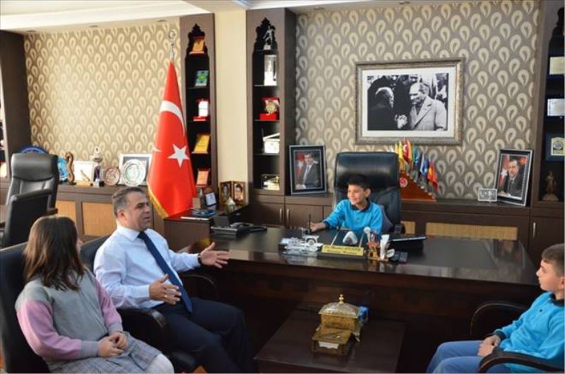 Okul Müdürü Mustafa Erikli ile birlikte Safranbolu Belediye Başkanı Dr. Necdet Aksoy`u ziyaret eden 3/A sınıfı öğrencileri Yağmur Damlacık, Enes Ahmet Şen ve Esma Bıyıklı ve Oğuzhan Çıplak sırası ile makama oturdular.