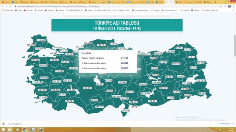 Sağlık Bakanlığı verilerine göre, Karabük´te, toplam aşı sayısı 77 bin 723´ü bulurken, 46 bin 820 kişiye birinci doz aşı, 30 bin 883 kişiye ikinci doz aşı uygulandı. 243 bin 614 nüfusa sahip Karabük´te 65 yaş üzeri 34 bin 285 kişi var. Aşılama kapsamında 65 yaş ve üzerine vatandaşların büyük çoğunluğu aşılandı.