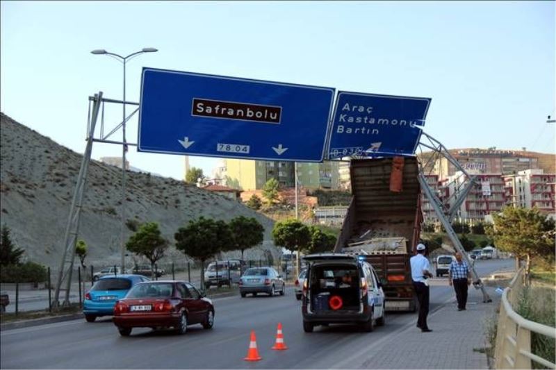 Edinilen bilgilere göre, İzzet Özdeş yönetimindeki 78 SP 263 plakalı damperli kamyon, Karabük - Safranbolu karayolu istikametinde seyir halindeyken, kamyonun damperi kendiliğinden açılarak, yön tabelalarına vurarak asılı kaldı. Trafiğin yoğun işlediği yol üzerinde tabelanın yola devrilmemesi, yaşanabilecek daha üzücü bir kazayı engelledi.