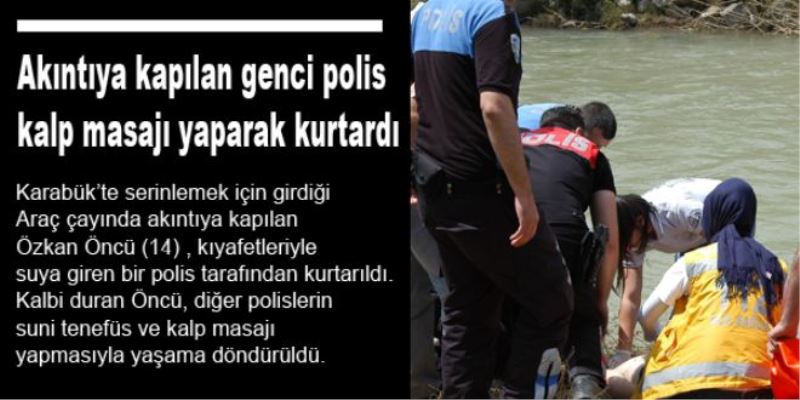 Haber verilmesi üzerine kısa sürede gelen polis ekibi çay boyunca yaklaşık 1.5 kilometre sürüklenen Özkan Öncü`yü suyun yüzeyinde gördü. Bir polis memuru kıyafetleriyle çaya girerek Öncü`yü kıyıya çıkardı.
