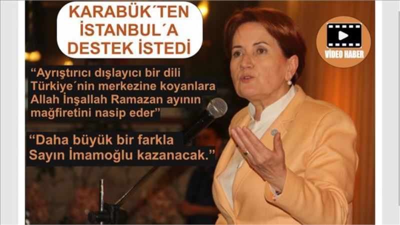İYİ Parti Genel Başkanı Meral Akşener, “İstanbul´da artık İmamoğlu İstanbul´un 16 milyonluk İstanbullunun Belediye Başkan Adayıdır sadece millet ittifakının değil. O nedenle Karabük´te yaşayıp akrabası İstanbul´da olanları üşenmeden tek tek arayacaksınız. Bu seçimle ilgili bu insanların gönlünü edeceksiniz, oylarına talip olacaksınız. İlçe ilçe yaptırdığımız çalışmada 2 milyon 780 bin civarında CHP seçmeni seçime gitmemiş görünüyor. Aynı zamanda 3 milyon 700 bin civarında AK Parti seçmeni de seçime gitmemiş. CHP seçmeninin sandığa gitmesini sağlayacağız ama 3 milyon 700 bin civarındaki AK Parti seçmenine de ulaşmamız gerekiyor.” dedi.