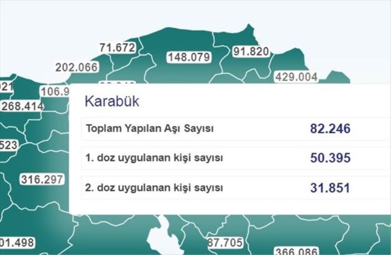 Sağlık Bakanlığı verilerine göre, Karabük´te, 50 bin 363 adet birinci doz aşı, 31 bin 851 adet ikinci doz aşı uygulanırken toplam aşı sayısı 82 bin 246´yı buldu.