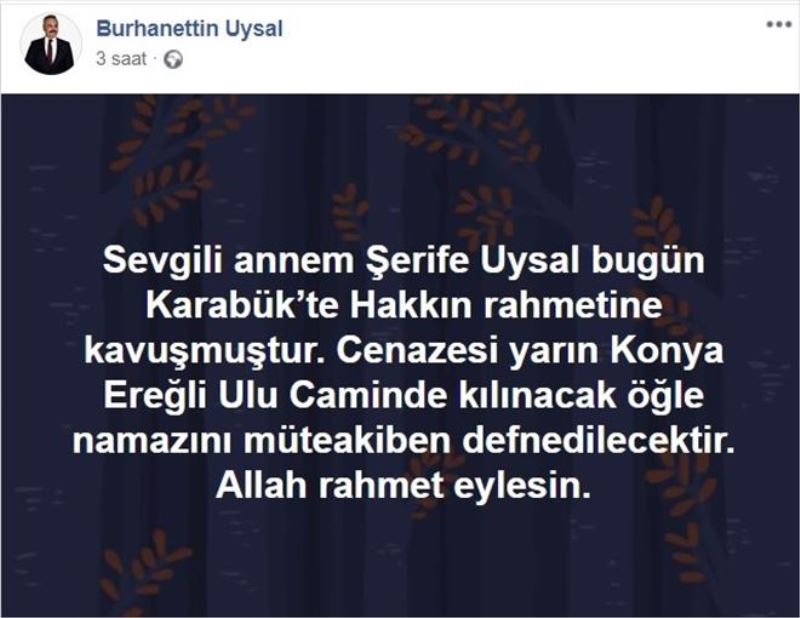 Karabük Üniversitesi Kurucu Rektörü ve 26.Dönem Karabük Milletvekili Prof. Dr. Burhanettin Uysal´ın annesi Şerife Uysal Hakk´ın rahmetine kavuştu. Merhumenin cenazesi yarın Konya Ereğli Ulu Camii´nde kılınacak öğle namazını müteakiben defnedilecek.
